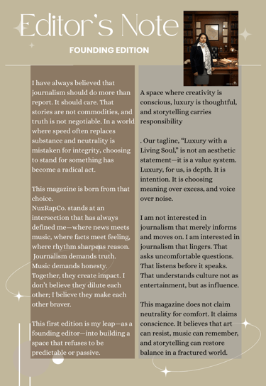 A space where creativity is conscious, luxury is thoughtful, and storytelling carries responsibility. Our tagline, “Luxury with a Living Soul,” is not an aesthetic statement—it is a value system. Luxury, for us, is depth. It is intention. It is choosing meaning over excess, and voice over noise. I am not interested in journalism that merely informs and moves on. I am interested in journalism that lingers. That asks uncomfortable questions. That listens before it speaks. That understands culture not as entertainment, but as influence.